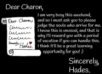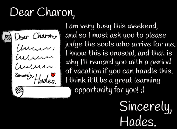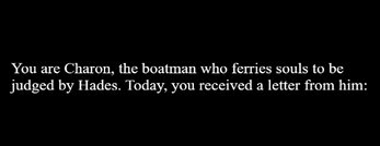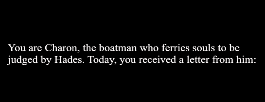 "Hades is busy this weekend. He has left you, Charon, in charge of judging the new souls that came into the underworld until he has returned. If you succeed, you'll get a nice vacation as a reward! Are you up to the task?"